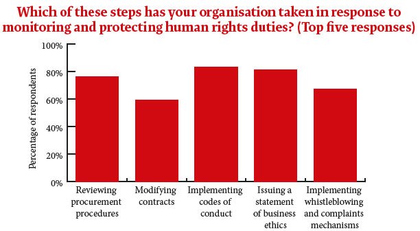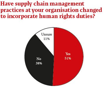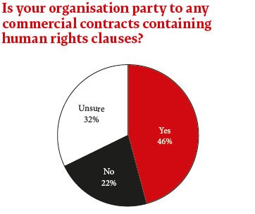 As noted already, nearly half of those surveyed had encountered human rights clauses in contracts, either in contracts issued by their own organisations or by counterparties. However, while the reference to human rights laws in contracts is spreading, GCs caution that the real impact will take several years to arrive. Lowry comments: ‘At Monsanto, anything with field labour involved will typically be covered by a human rights clause and we have recently moved to including human rights clauses with rights to audit into commercial contracts. But this is still a journey on the commercial side. It’s difficult enough to insist on something when you are the buyer. It’s even more difficult when it is a sales-side commercial relationship. We will get there, however.’