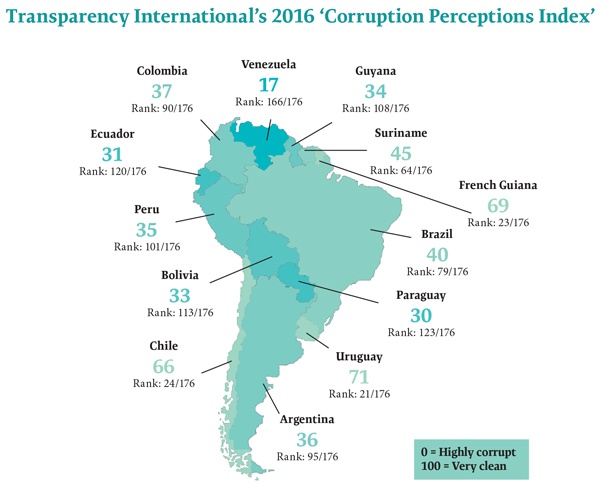 According to Transparency International’s 2016 ‘Corruption Perceptions Index’, Brazil ranks among the least corrupt countries in South America. Sitting at 40th place, it appears a full 23 places above the country perceived as the worst offender, Venezuela. The only independent countries in South America not coloured ominously dark (indicating high levels of corruption) are Chile and Uruguay.