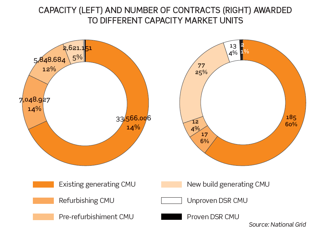 The diagram below illustrates the capacity (left) and number of contracts (right) awarded to different Capacity Market units (CMUs) under the first auction round, split by type of participant.