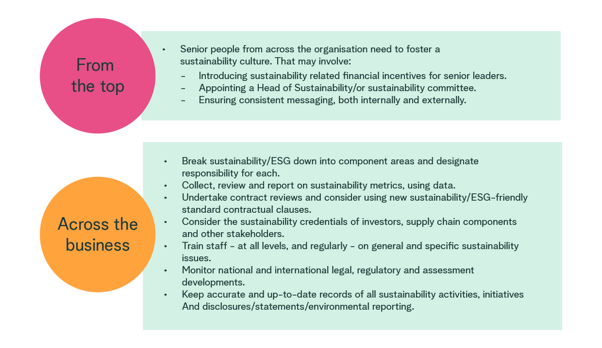 A successful, practical approach to addressing sustainability requires leadership from the top down, including the right cultural messaging and dedicated resource, combined with business-wide data, operational and contract reviews, training and ongoing monitoring: