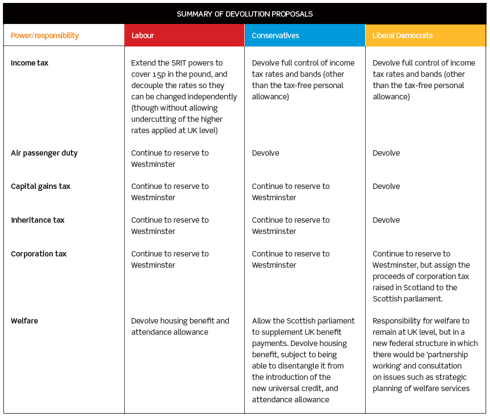 However, the principal pro-union parties took the view during the referendum campaign that these changes were insufficient to meet a perceived desire among voters for greater devolution. They therefore produced proposals in the spring for devolving additional powers in the event of a ‘no’ vote. These proposals focused chiefly on tax and welfare powers, and each party’s principal suggestions in those areas are briefly summarised (in the accompanying table (to the extent it is possible to summarise several hundred pages worth of proposals!)).