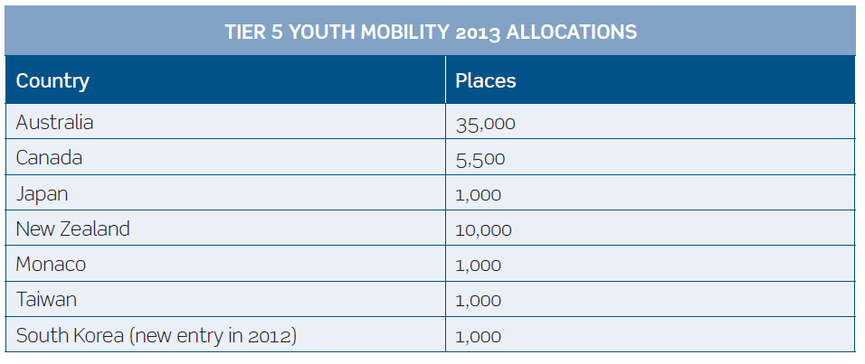 The Tier 5 Youth Mobility 2013 allocations have been released (see table below).