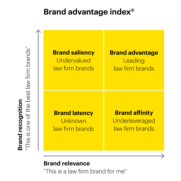 One of the simplest and most robust measures you can track over time, is your brand advantage score. This can be deduced from two market survey questions: (1) Who do you consider to be one of the best brands, and (2) Which brands are you familiar with? The firms that rank highly on both questions will achieve a high brand advantage score.This methodology allows you to track your own brand performance versus your competition and is also a good predictor of clients’ propensity to do business with you.