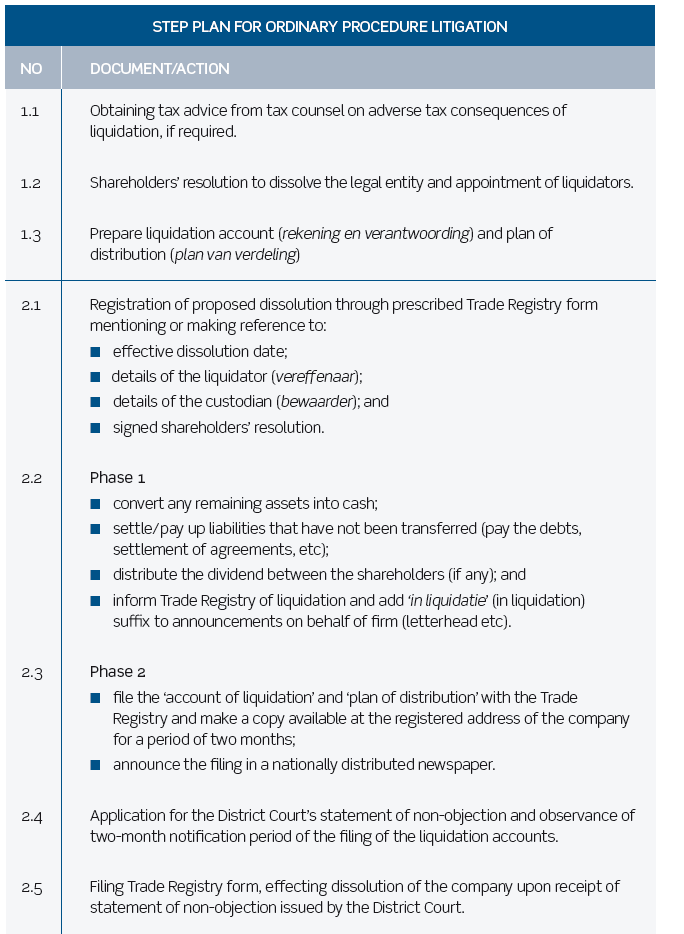 If the fast-track procedure is not available, the ordinary procedure has to be followed.If the company is wound up as a result of a resolution of the shareholders’ meeting and liquidation is still required, the company continues to exist. However, only to the extent required for liquidation. In documents and announcements issued by the company, the words ‘inliquidatie’ (in liquidation) must be added as a suffix to its corporate name, so that it is clear to the public that the legal entity is in liquidation and that the scope of the company’s objectives has to be assessed in this light.