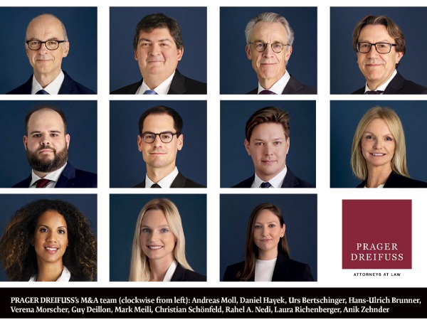 The PRAGER DREIFUSS M&A team is led by Andreas Moll and Daniel Hayek. The team consists of six partners (Andreas Moll, Daniel Hayek, Urs Bertschinger, Hans-Ulrich Brunner, Verena Morscher, Guy Deillon) and a number of highly skilled counsels and associates (Mark Meili, Christian Schönfeld, Rahel A. Nedi, Laura Richenberger, Anik Zehnder).
