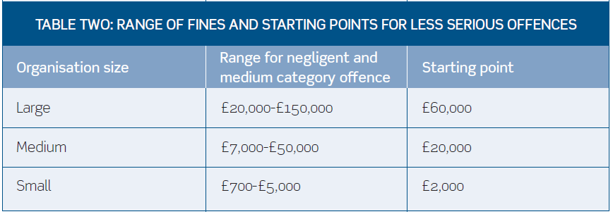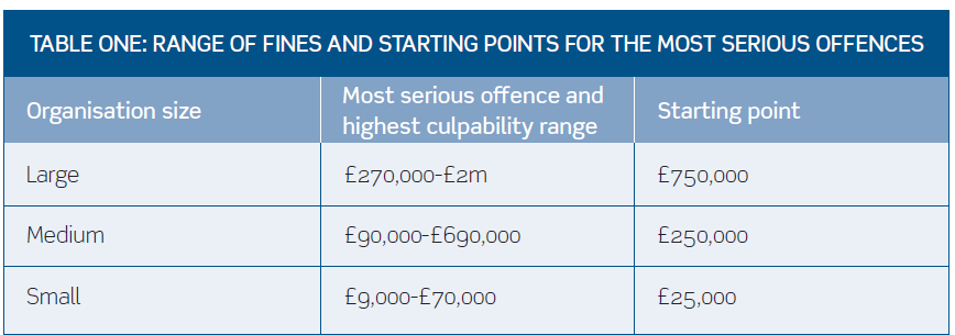 Set out below in Table One is the range of fine and starting points for the most serious offences with the highest culpability, for large, medium and small organisations, to give you an indication of how, in future, these penalties could really hurt businesses.