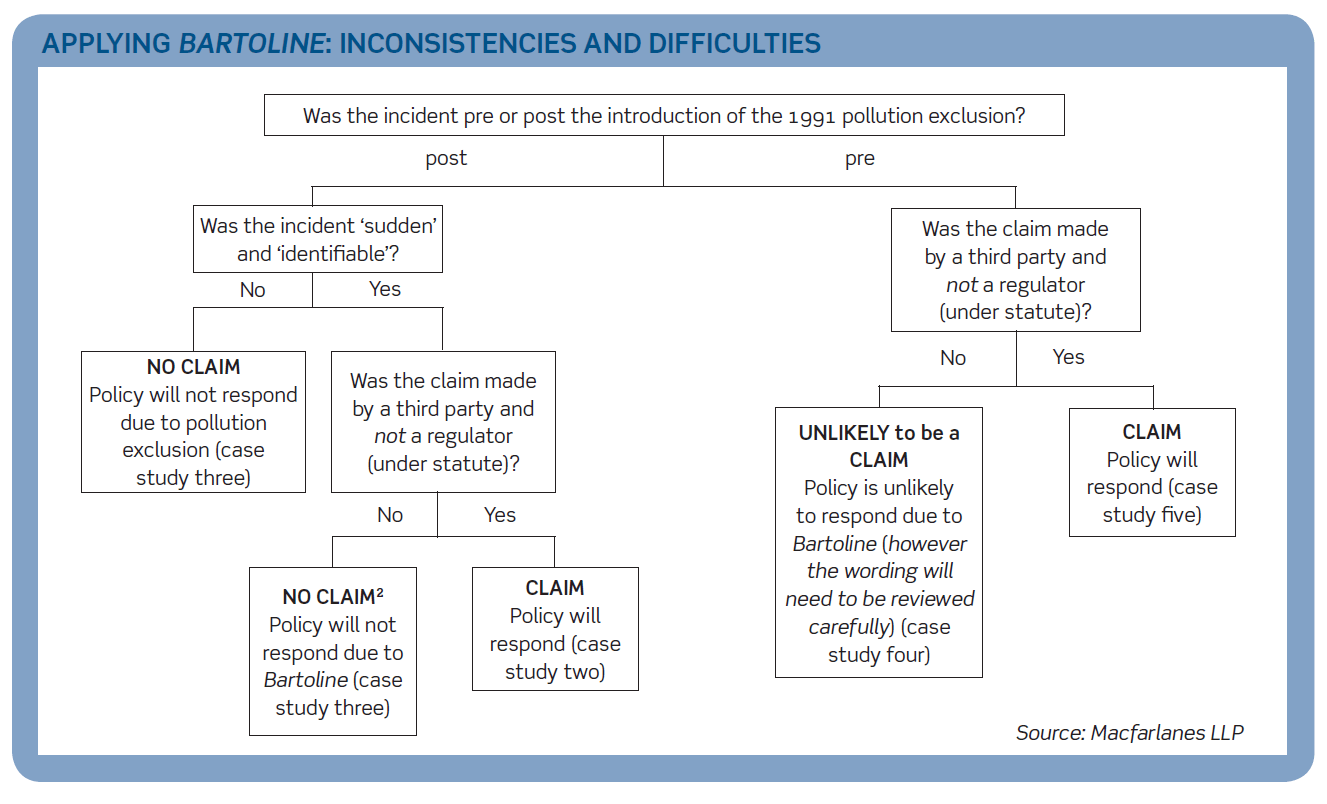 The key milestone for environmental coverage under most PL policies was the introduction in 1991 of pollution exclusion wordings pursuant to the Association of British Insurers guidelines and/or the Lloyds NMA 1685 clause, such that only pollution as a result of a ‘sudden identifiable… incident’ is covered – ie ‘gradual’ pollution is excluded. While some policy holders are more conscious of environmental risks and elect to negotiate a specialist environmental insurance policy, others have simply relied upon their PL policy for indemnification against all environmental liabilities. However, with the introduction of the pollution exclusion wording and the decision in Bartoline, recovery under PL policies has become increasingly complex.