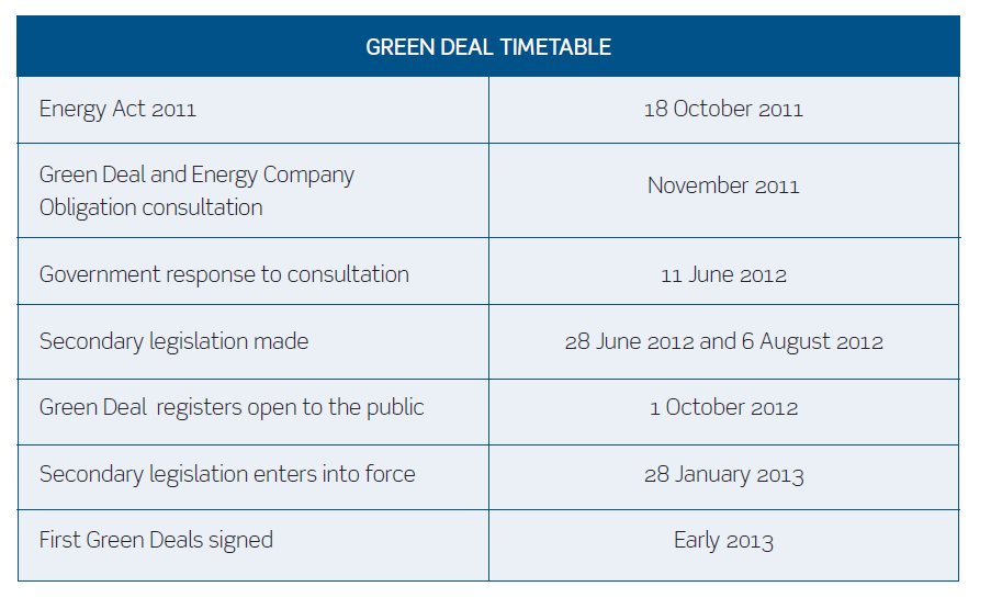 On the introduction of the 2011 Act, we wrote about the basic mechanics of the Green Deal and some of the initial key concerns and questions to come out of the developing policy the (The In-House Lawyer 196, December 2011/January 2012). The 2011 Act was followed by a wide-ranging consultation in November last year (the consultation) which elicited over 600 responses1. After a significant pause in the policy-generating process, the department for Energy and Climate Change (DECC) published its response in June 2012 (the response) and began to pass the statutory instruments required to fill in the legislative detail2. The registers for Green Deal providers, assessors and installers opened on 8 August 2012, allowing organisations to apply to take part and earn the right to use the all-important Green Deal Quality Mark to demonstrate they comply with the required Green Deal standards. The first Green Deals are now expected to be signed in 2013.